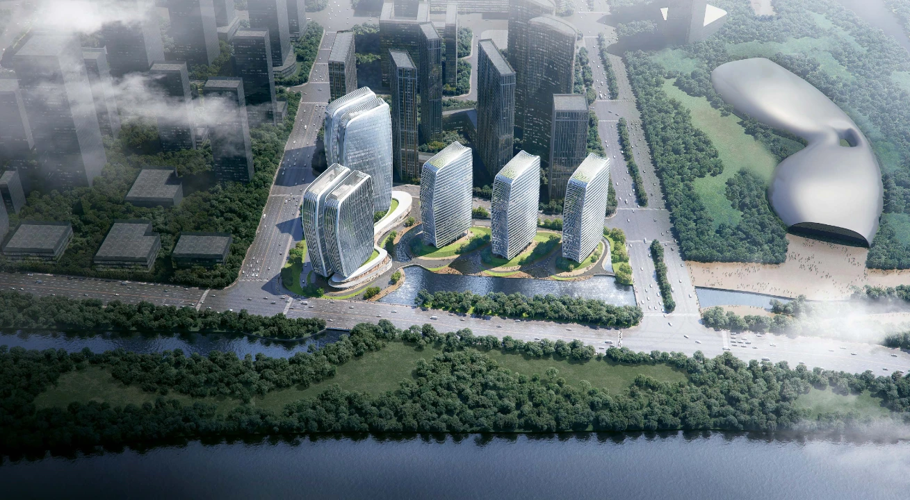 本项目位于浙江杭州,总用地面积43985㎡,总建筑面积334290㎡,其中地下面积114365㎡,建筑高度130m。含T1~T5办公楼、商业。