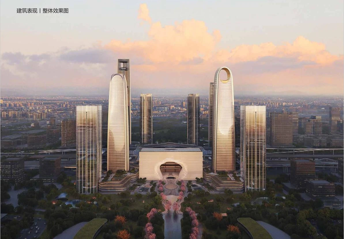建筑高度:A楼(320米,包含五星级酒店、办公)、B楼(300米,包含四星级酒店、办公)及四期C、D楼(213米,高端公寓)