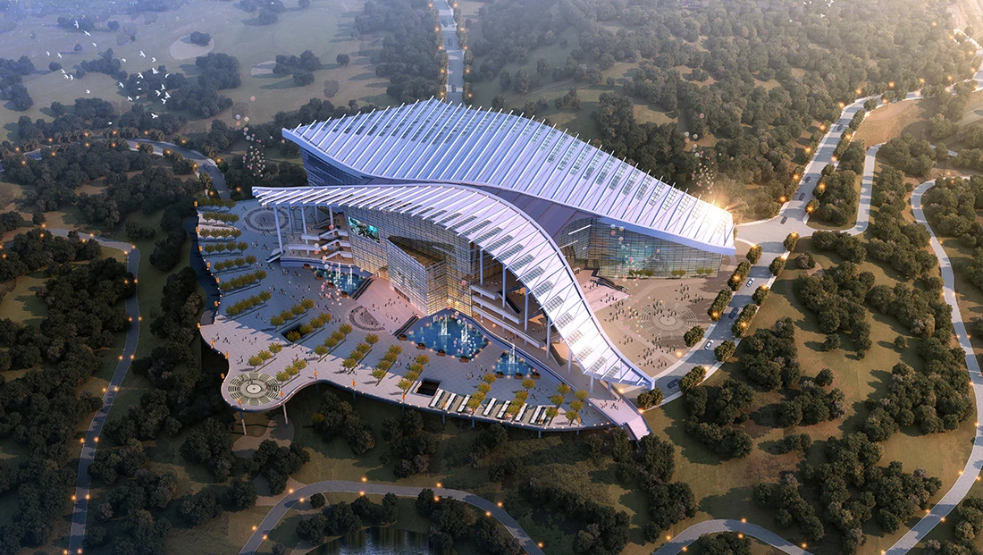 该项目是目前国内规模最大的专业电子竞技比赛场馆,项目位于重庆市忠县复兴镇水坪社区,占地面积180亩,总建筑面积约为181067m²,项目包含A地块电竞中心及D地块的孵化及新闻中心,建筑功能包括电竞场馆、电竞展示厅、电竞孵化中心及新闻中心。